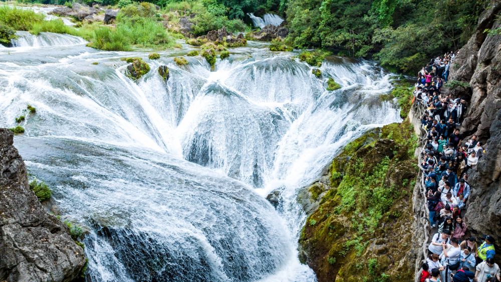 5月2日,游客在貴州省安順市天星橋景區(qū)游覽銀鏈墜潭瀑布(無人機(jī)照片)。 新華社發(fā)(陳熙 攝)
