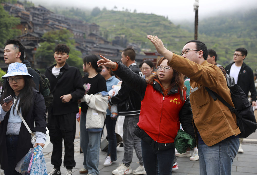 5月3日,黨員志愿者在貴州省黔東南苗族侗族自治州雷山縣西江千戶苗寨景區(qū)為游客指路。新華社發(fā)(吳賢燕 攝)