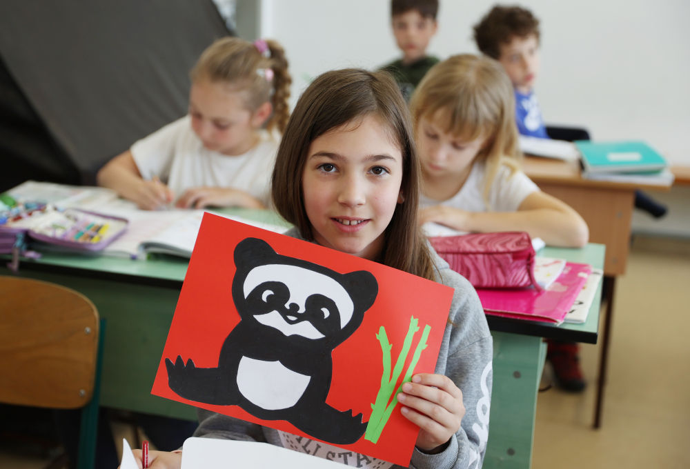 匈中雙語(yǔ)學(xué)校三年級(jí)學(xué)生寶怡展示自己的大熊貓形象美術(shù)作品(2024年5月3日攝)。