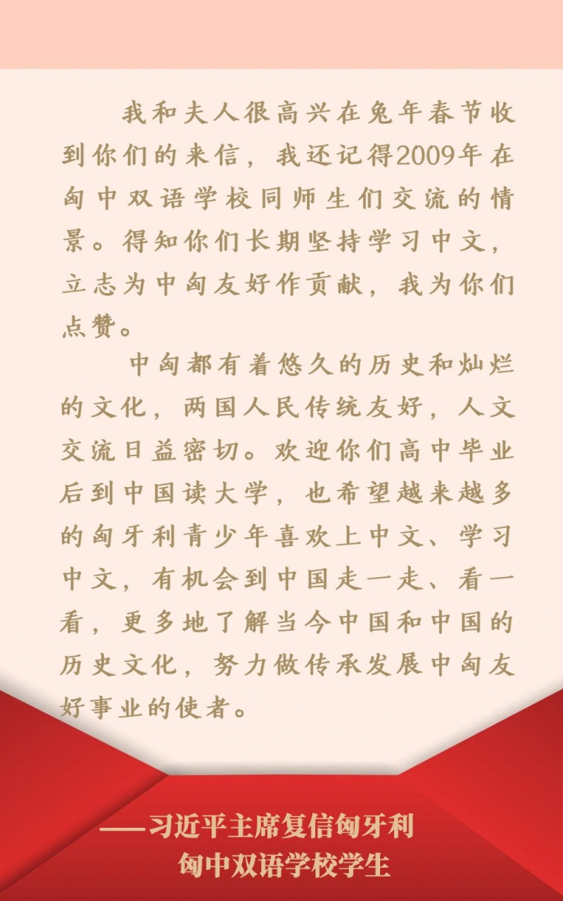 2023年春節(jié)前夕,匈中雙語(yǔ)學(xué)校學(xué)生胡靈月、宋智孝代表全校學(xué)生致信習(xí)近平主席和夫人彭麗媛教授,按照中國(guó)風(fēng)俗拜年,講述在校學(xué)習(xí)中文12年的感受,表達(dá)將來(lái)到中國(guó)上大學(xué)、為匈中友好作貢獻(xiàn)的愿望。