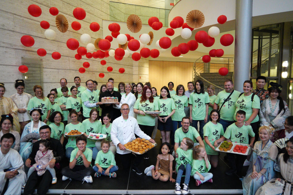 2023年9月3日,人們?cè)谛傺览虏祭丈锌藸柷幸廖幕行膮⒓印暗谒膶眯傺览嘛炛谱鞣弧被顒?dòng)并合影。在此次活動(dòng)上,500多名當(dāng)?shù)厥忻颀R聚一堂,制作中秋月餅,體驗(yàn)中國(guó)傳統(tǒng)文化。
