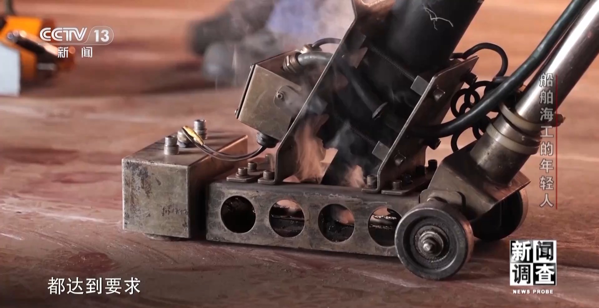 江蘇大洋海洋裝備有限公司技能大師工作室主任 孫玉龍:這個(gè)板子比較特殊,它是EH690鋼,硬度比較高,板厚也比較厚。想把它焊合格是很難的,兩個(gè)人要焊一天。焊不好它會(huì)產(chǎn)生內(nèi)部缺陷,比如說氣孔、裂紋等一系列的缺陷在里面。