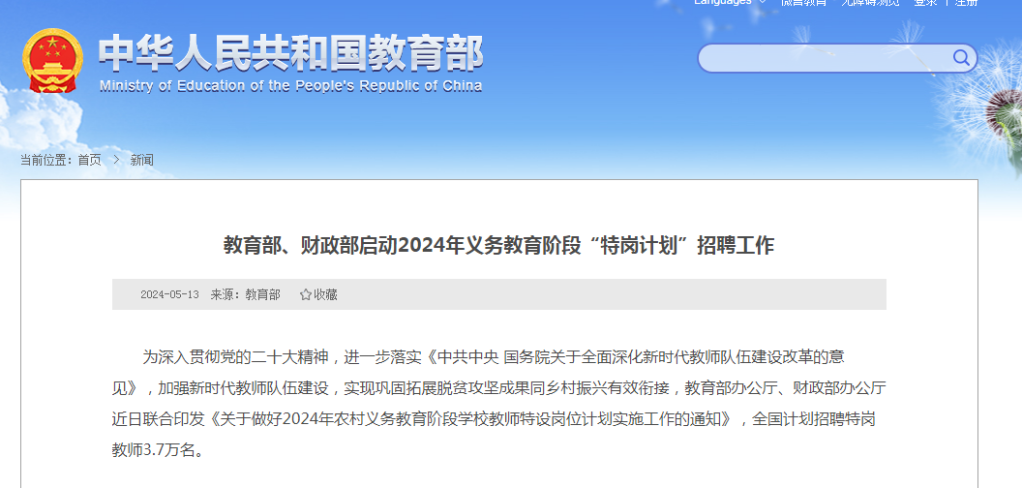 記者5月13日從教育部獲悉,教育部辦公廳、財(cái)政部辦公廳近日聯(lián)合印發(fā)通知,就做好2024年農(nóng)村義務(wù)教育階段學(xué)校教師特設(shè)崗位計(jì)劃實(shí)施工作進(jìn)行部署。根據(jù)通知,2024年全國計(jì)劃招聘“特崗計(jì)劃”教師37000名。