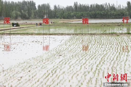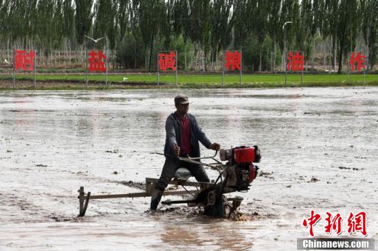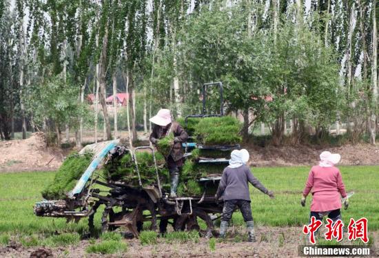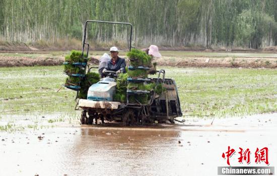 5月13日,在位于該市帕哈太克里鄉(xiāng)的“海水稻”種植基地,各類機(jī)械和工作人員都忙碌起來,搶抓農(nóng)時進(jìn)行“海水稻”播種工作。隨著氣溫回升,新疆喀什市的1.3萬畝“海水稻”進(jìn)入插秧期。圖為工作人員駕駛著插秧機(jī),搶抓農(nóng)時進(jìn)行“海水稻”播種工作。