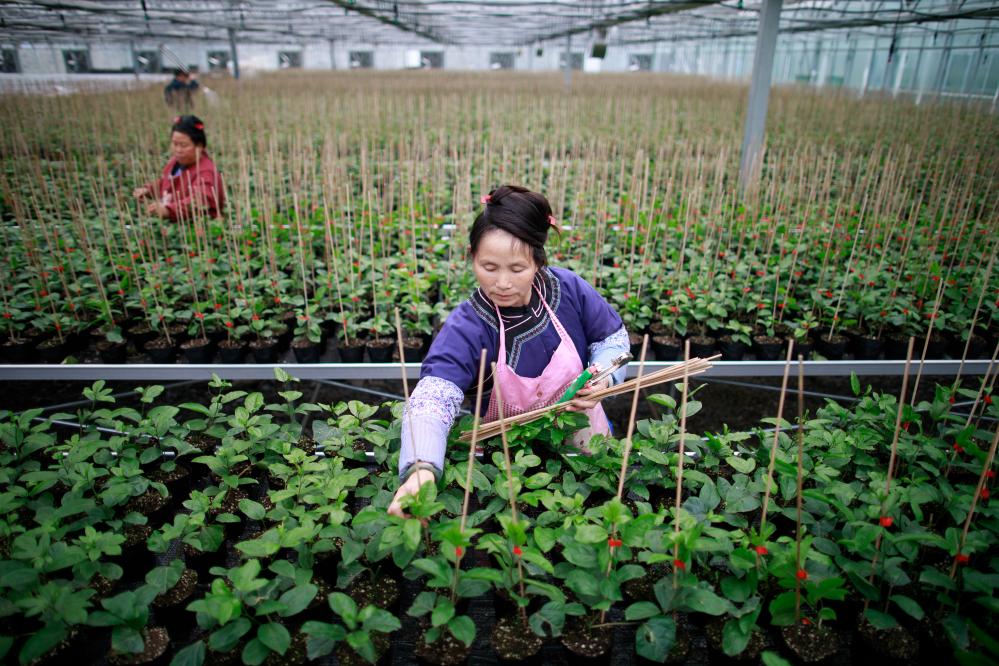在貴州省榕江縣車江壩區(qū)智慧育苗中心內(nèi),一名少數(shù)民族婦女在大棚內(nèi)對百香果苗進(jìn)行管理(2023年2月28日攝)。新華社記者 劉續(xù) 攝