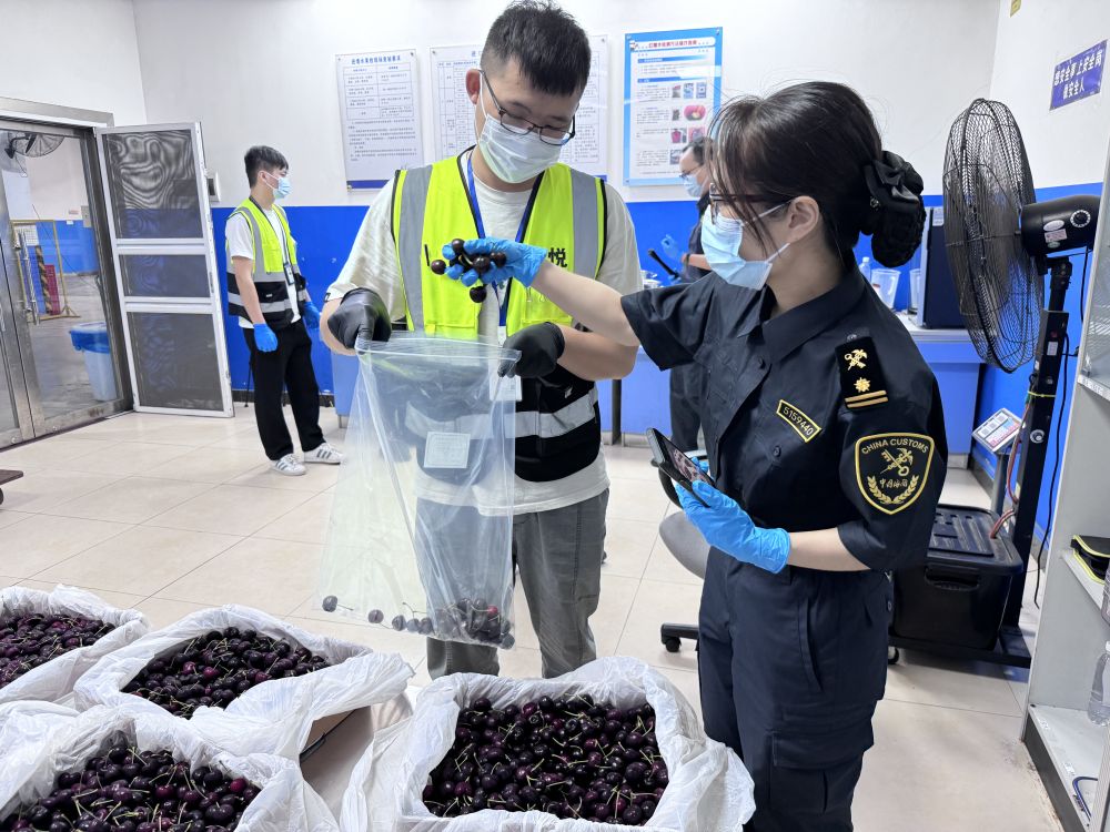 廣州白云機場海關(guān)關(guān)員對新產(chǎn)季進口車厘子進行監(jiān)管。(受訪者供圖)