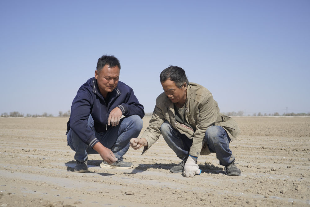 2024年4月23日,雙泉農(nóng)業(yè)專(zhuān)業(yè)合作社負(fù)責(zé)人何洪濤(左)在棉田里工作。