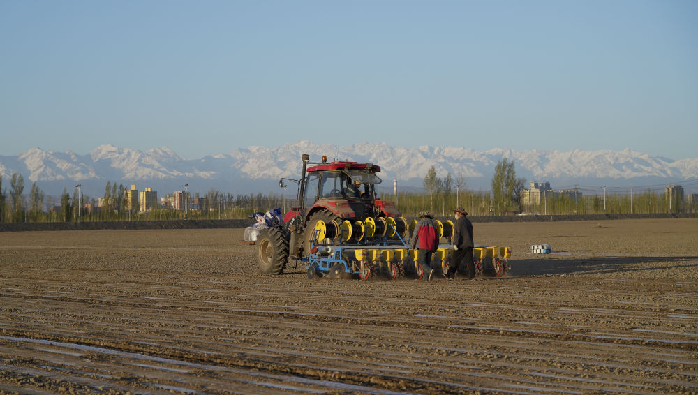 從哈衣繞拉管理的棉田向南望去,可見(jiàn)綿延起伏的天山山脈,終年不化的積雪、線(xiàn)條硬朗的山脊、若隱若現(xiàn)的云杉,像一幅氣勢(shì)磅礴的風(fēng)景畫(huà)。一臺(tái)高大的機(jī)器正按照北斗導(dǎo)航設(shè)計(jì)的路線(xiàn)筆直地行進(jìn),車(chē)尾安裝的自動(dòng)化播種設(shè)備將透明的薄膜、黑色的滴灌帶、紅色的包衣棉籽,一并整齊地埋進(jìn)褐色的泥土里。