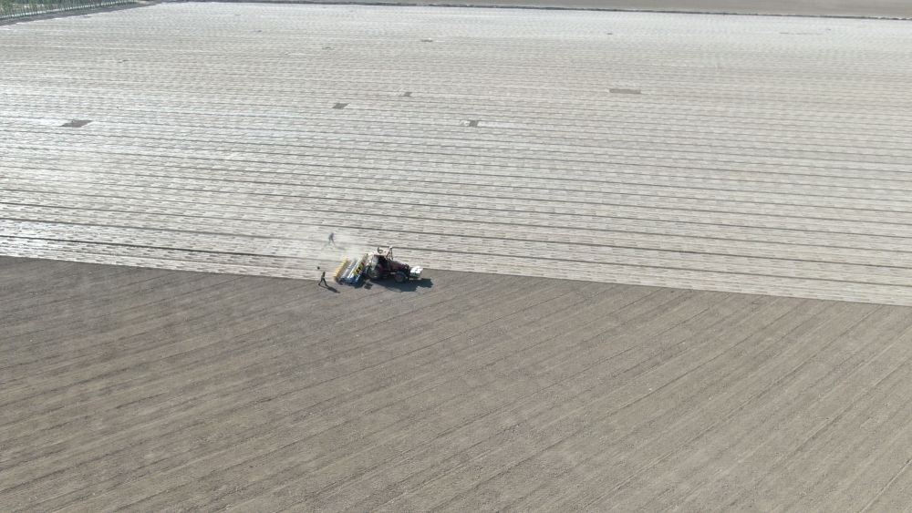 2024年4月23日,在新疆沙灣市,播種機(jī)在棉田里播種棉花(無(wú)人機(jī)照片)。