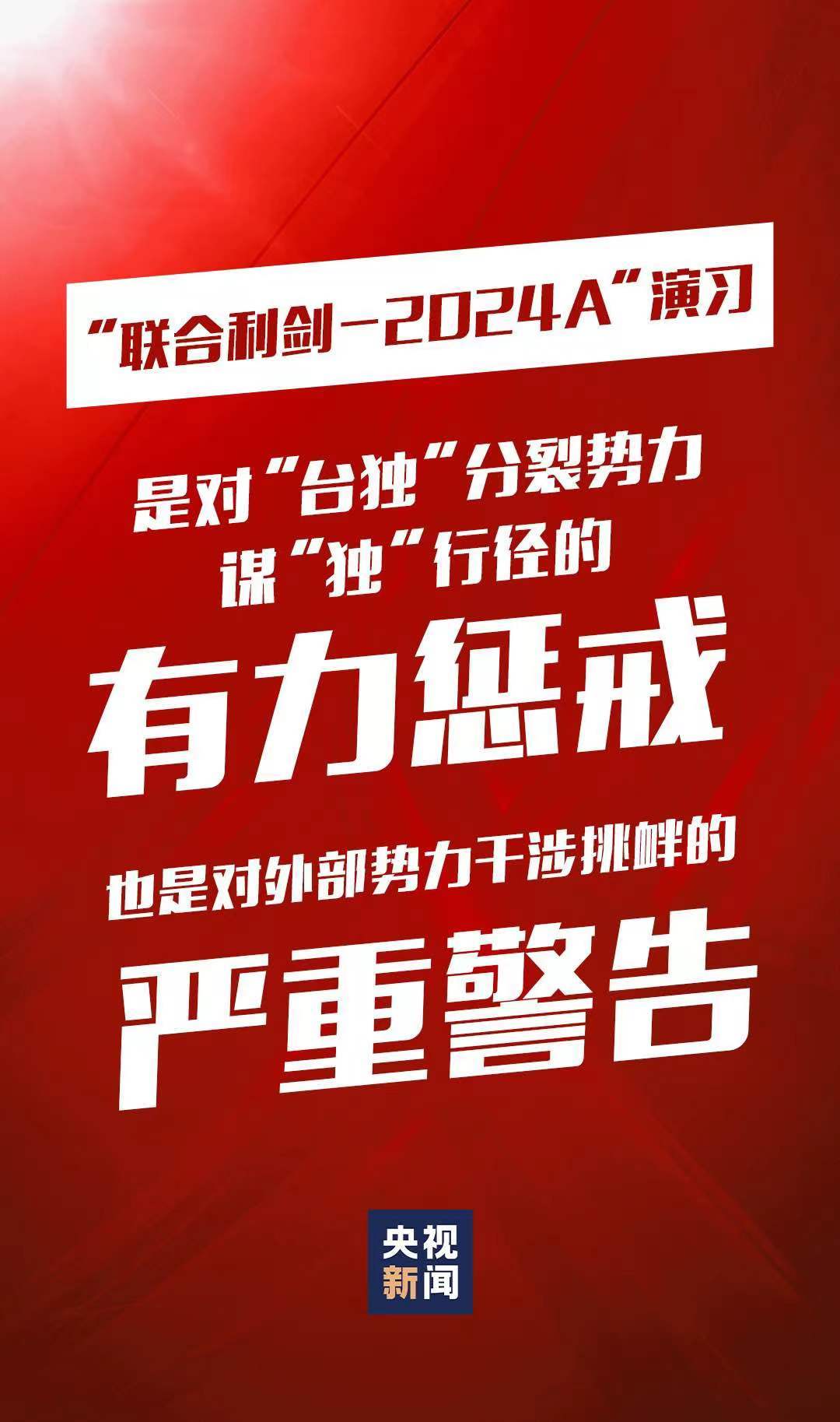 5月23日至24日,中國人民解放軍東部戰(zhàn)區(qū)組織戰(zhàn)區(qū)陸軍、海軍、空軍、火箭軍等兵力,位臺島周邊開展“聯(lián)合利劍-2024A”演習(xí),重點演練聯(lián)合海空戰(zhàn)備警巡、聯(lián)合奪取戰(zhàn)場綜合控制權(quán)、聯(lián)合精打要害目標(biāo)等科目,艦機抵近臺島周邊戰(zhàn)巡,島鏈內(nèi)外一體聯(lián)動,檢驗戰(zhàn)區(qū)部隊聯(lián)合作戰(zhàn)實戰(zhàn)能力。這是中國維護國家主權(quán)和領(lǐng)土完整的正義之舉,也是對“臺獨”分裂勢力謀“獨”行徑的有力懲戒,對外部勢力干涉挑釁的嚴(yán)重警告。