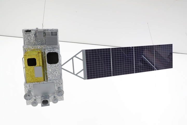 5月24日,在上海市閔行區(qū)的“大零號灣”創(chuàng)新策源館拍攝的風(fēng)云三號G星氣象衛(wèi)星模型。新華社記者 龔兵 攝