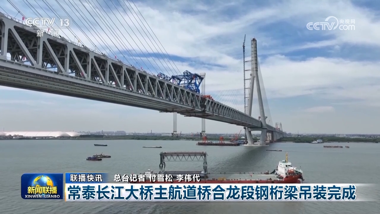 常泰長江大橋主航道橋合龍段鋼桁梁吊裝完成