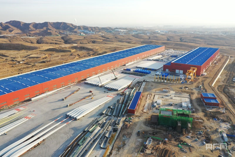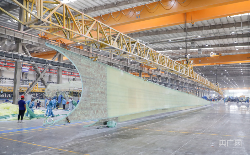 6條百米級及以上葉片生產線上,一個超百米長的“裸裝“風力發(fā)電葉片放置車間中央,靜待技術人員“美顏”包裝。自主研制的陸上超大型玻纖葉片便是從這里運往沙漠、戈壁、荒漠地區(qū)。