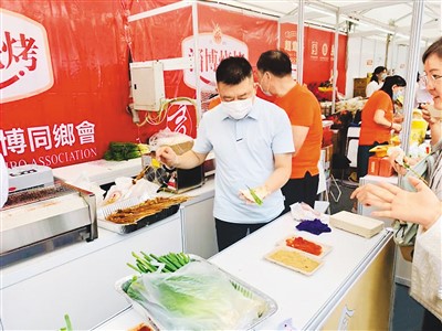 香港淄博同鄉(xiāng)會(huì)會(huì)長(zhǎng)耿國(guó)華在淄博燒烤攤位制作特色美食。
