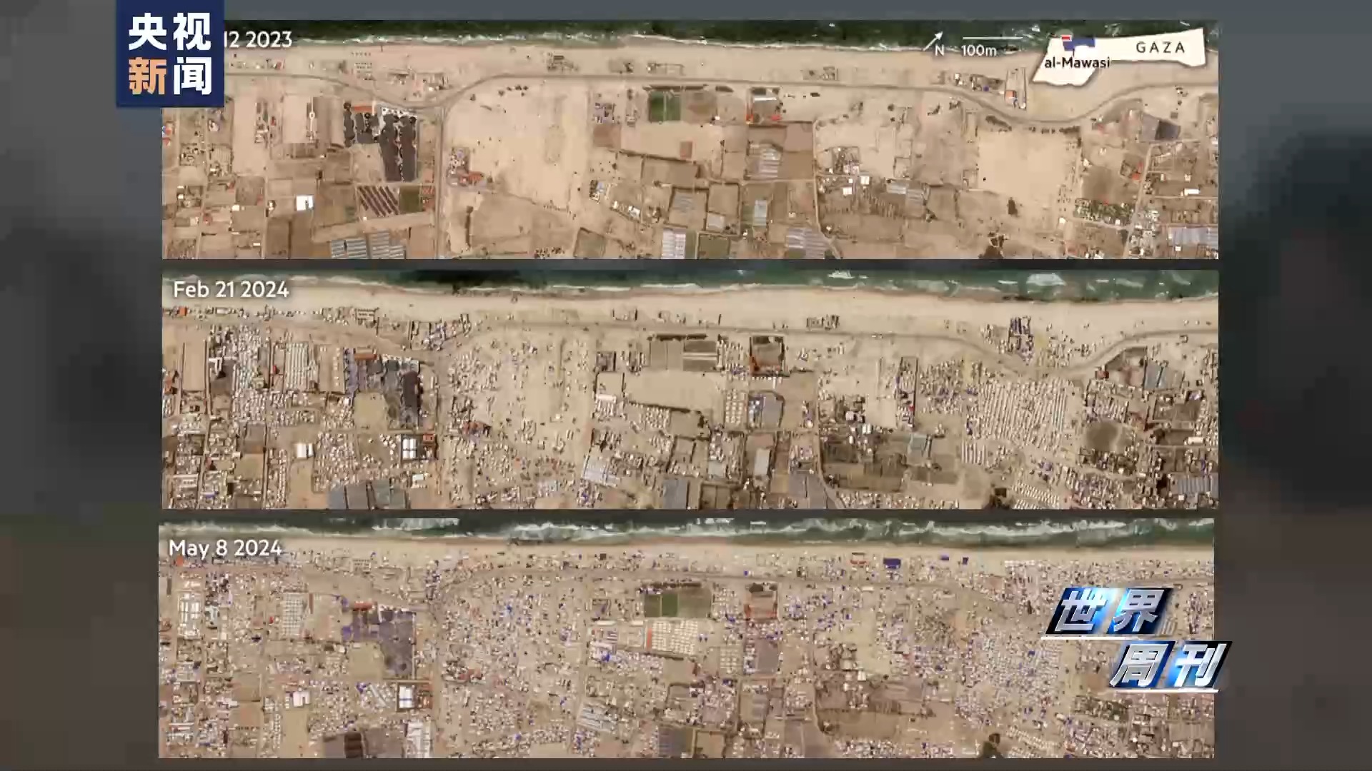 最新的衛(wèi)星圖像顯示,這些人道主義區(qū)域布滿(mǎn)了帳篷和塑料布搭建的臨時(shí)建筑,甚至一路延伸到沙灘上,最近的一排距離大海只有幾步之遙。