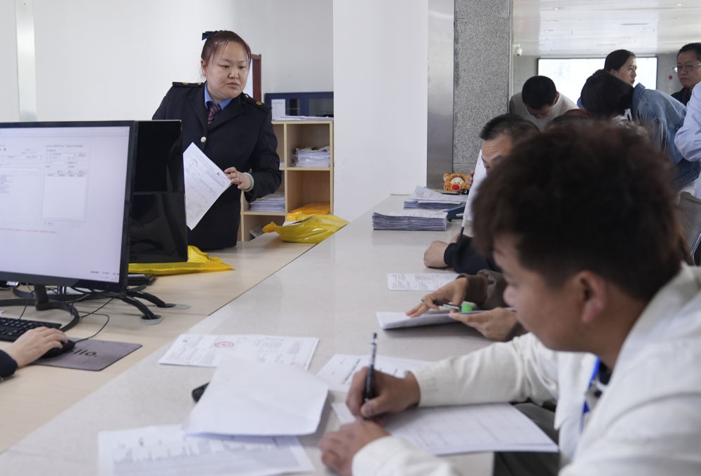 在霍爾果斯鐵路口岸站聯(lián)運大廳內(nèi),出口貨運員在為客戶辦理更正國際聯(lián)運運單業(yè)務(wù)(5月29日攝)。