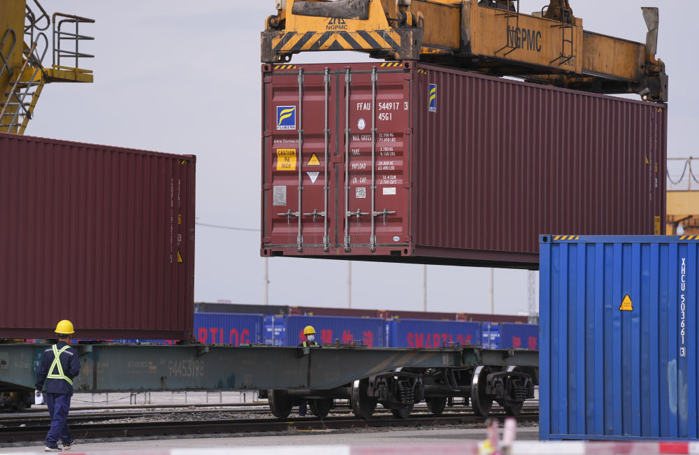 在新疆霍爾果斯鐵路口岸換裝場拍攝的班列換裝作業(yè)現(xiàn)場(5月29日攝)。