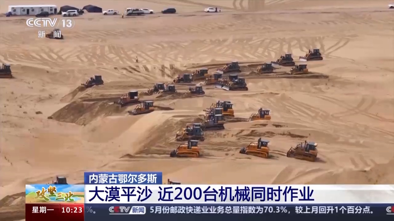 此刻,在我身后,近200臺推土機正在這片沙漠上來回穿行,他們要把這些高低起伏、連綿不斷的沙丘推平整了,再安裝光伏板。這么多推土機具體是如何作業(yè)的?技術人員告訴我們,因為地形的原因,今天現(xiàn)場的推平作業(yè)大致分為兩個梯隊:第一梯隊負責在沙丘的最上面,把頂部的沙子推下來;第二梯隊隨后,填平沙坑,平整現(xiàn)場。
