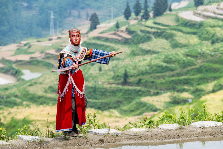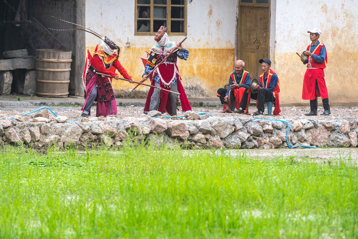 又是一年武陵山間水稻插秧季。在重慶市酉陽土家族苗族自治縣銅鼓鎮(zhèn)清泉村,水稻田間時(shí)時(shí)回響著極具地方特色的戲曲唱段,一群特別的非遺技藝陽戲(酉陽土家面具陽戲)表演者,往來于田間地頭。他們忙時(shí)翻土培秧,準(zhǔn)備著水稻插秧,閑時(shí)則舞槍弄?jiǎng)?,排演著表演劇目?/p>
