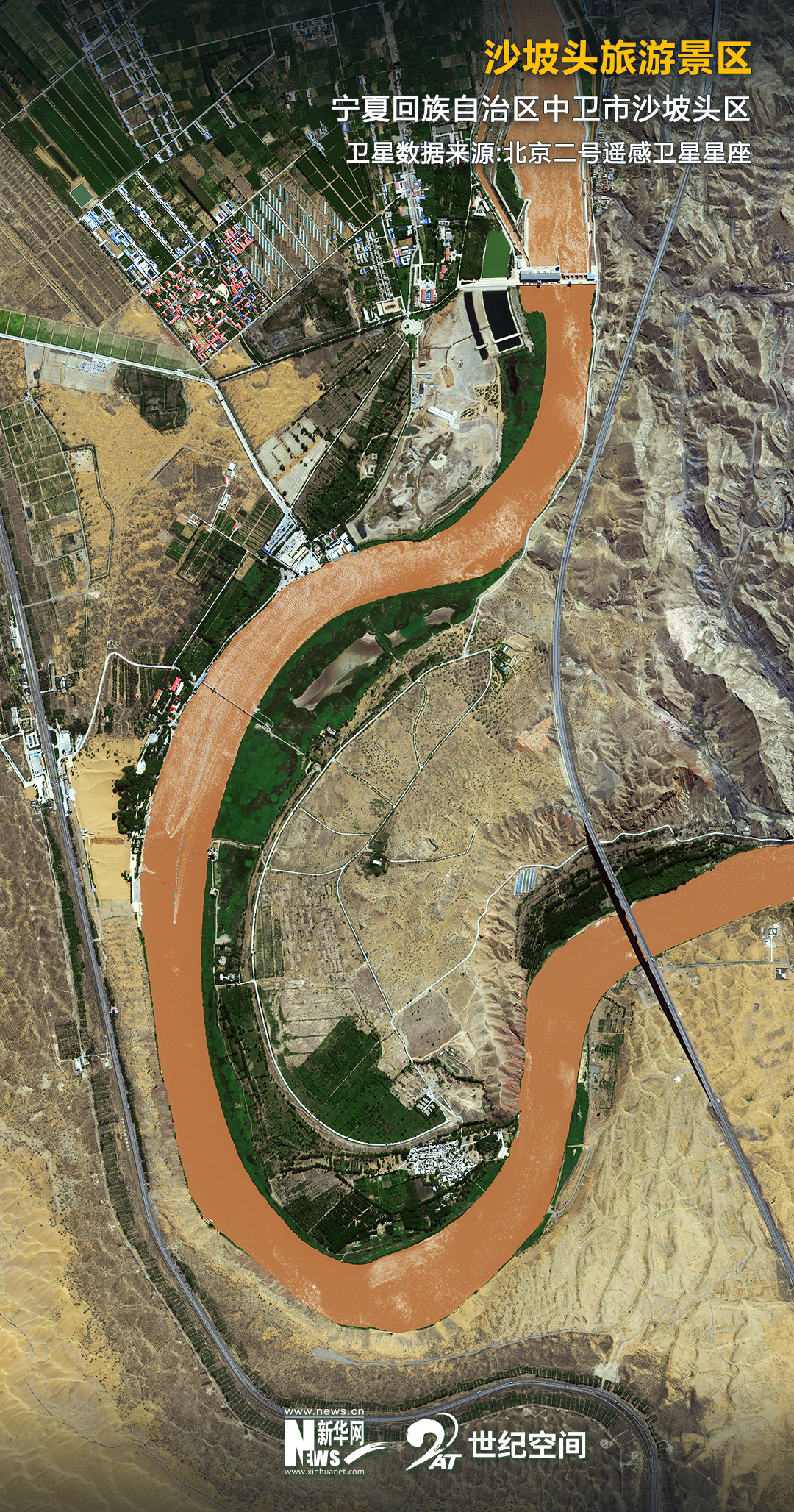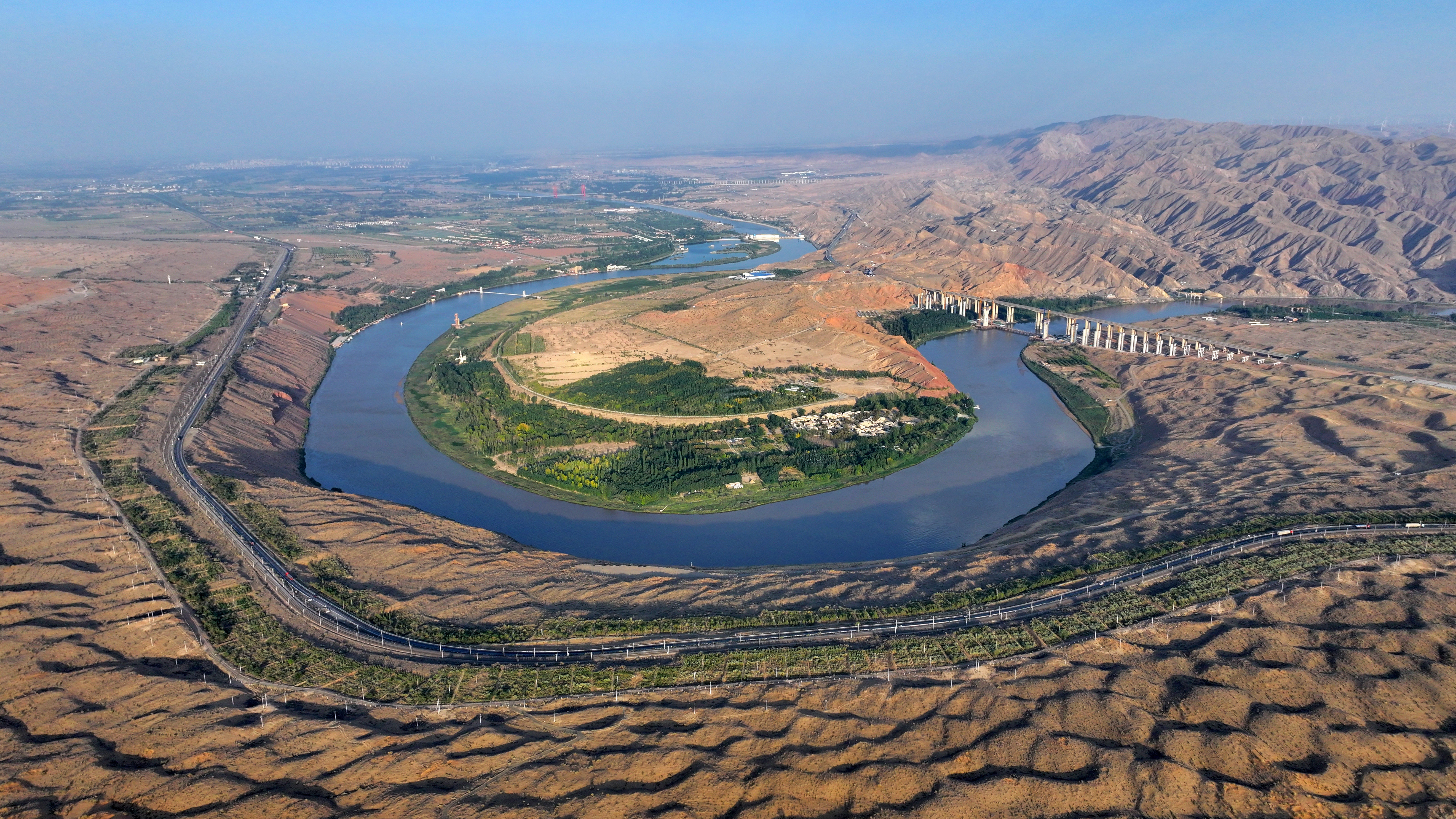 如今,在當(dāng)?shù)赜嘘P(guān)部門(mén)開(kāi)展的水系疏浚工程影響下,這里成為沙漠濕地的聚集地。黃河流經(jīng)此地,畫(huà)出了一道蜿蜒的曲線。河的一頭是騰格里沙漠的無(wú)垠瀚海,另一頭被一抹蒼翠鑲嵌在河岸邊。