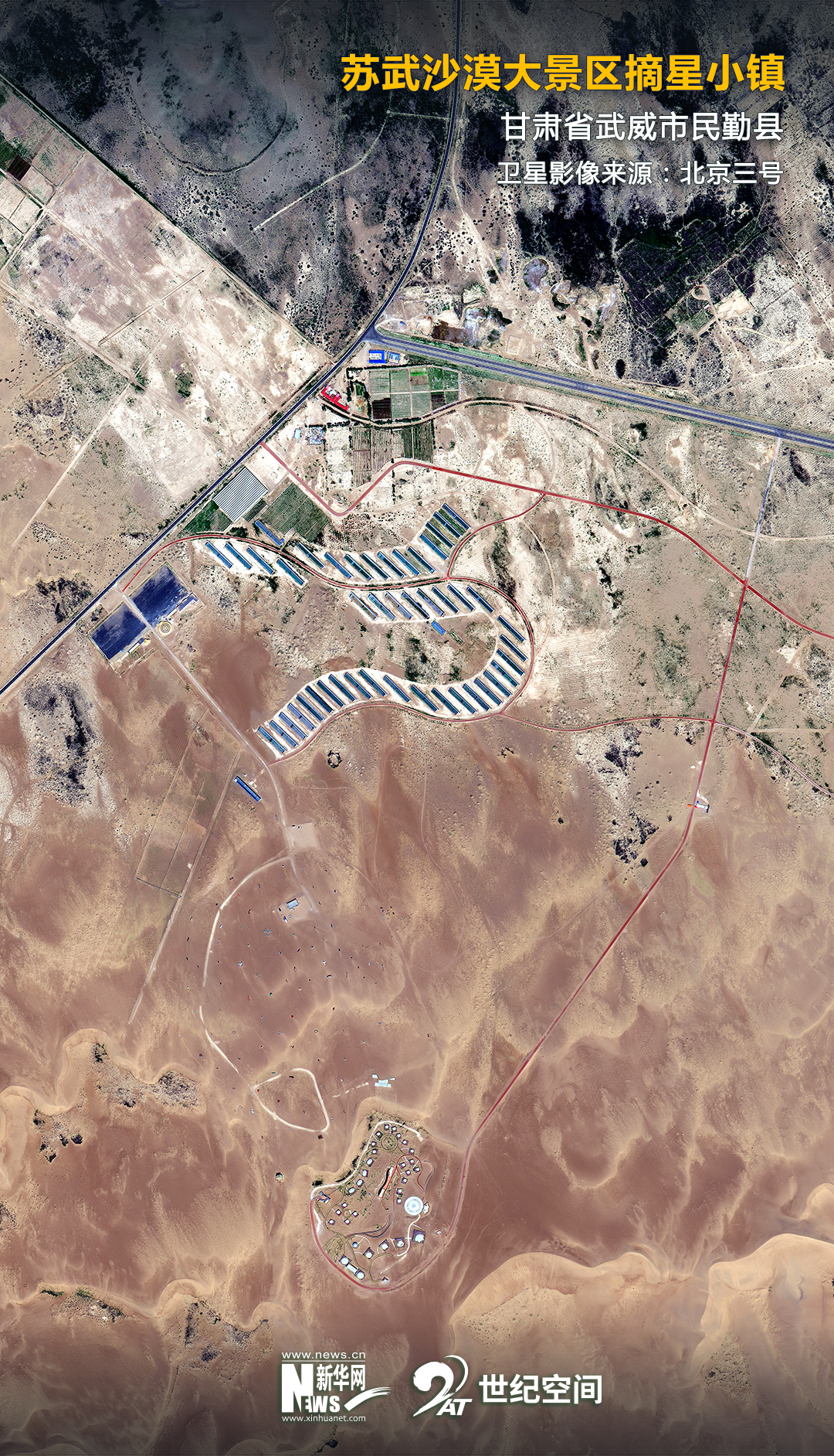 這是甘肅省民勤縣沙漠腹地的“摘星小鎮(zhèn)”(2021年3月4日攝,無(wú)人機(jī)照片)。新華社記者 郎兵兵 攝