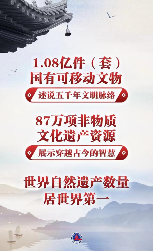 1.08億件(套)國有可移動文物述說五千年文明脈絡,87萬項非物質(zhì)文化遺產(chǎn)資源展示穿越古今的智慧,世界自然遺產(chǎn)數(shù)量居世界第一……文化和自然遺產(chǎn)濃縮著中華文明發(fā)展和自然演進的珍貴成果。