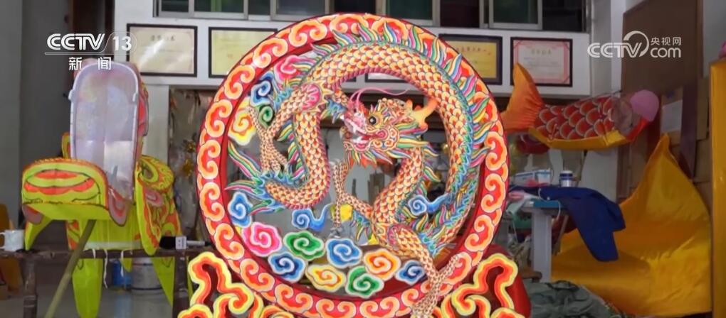 這件精美的龍燈彩扎藝術品,名叫《飛龍在天》,是由非遺傳承人周合平歷時3個月完成的,馬上就要送往北京,收藏在中國非物質文化遺產館。在這間扎龍工作室里,記者看到,大家正在趕制一批表演用的龍燈。