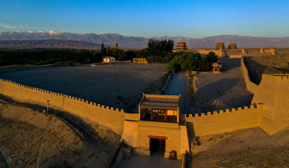 位于甘肅省嘉峪關(guān)市的嘉峪關(guān)關(guān)城(2023年7月13日攝,無(wú)人機(jī)照片)。新華社記者 劉金海 攝