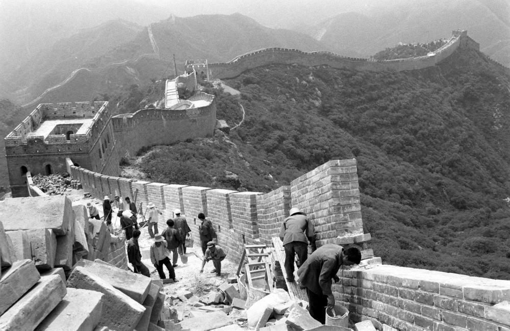 工人正在修復(fù)北京八達(dá)嶺長(zhǎng)城的一段城墻。這是用由北京晚報(bào)、八達(dá)嶺特區(qū)辦事處等單位聯(lián)合發(fā)起“愛(ài)我中華 修我長(zhǎng)城”社會(huì)贊助活動(dòng)所獲款項(xiàng)進(jìn)行修復(fù)的第一期工程 (資料照片,1984年8月11日發(fā))。新華社記者 袁汝遜 攝