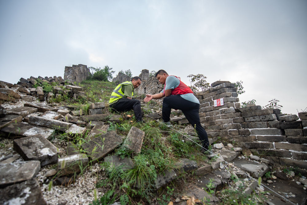 技工楊戰(zhàn)杰(右)在指導(dǎo)工人拉線劃設(shè)北京箭扣長(zhǎng)城研究性修繕考古發(fā)掘范圍(2022年8月17日攝)。新華社記者 陳鐘昊 攝