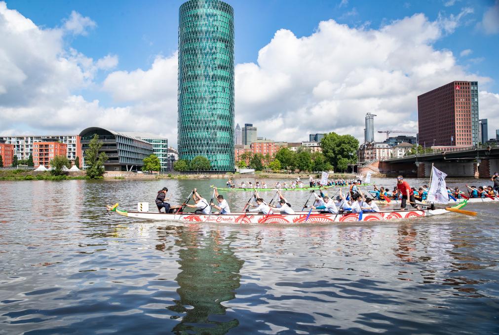5月25日,在德國法蘭克福,龍舟隊伍在美因河上參加比賽。第一屆法蘭克福國際龍舟友誼賽暨2024年法蘭克福中國節(jié)開幕式當日舉行,來自中國、德國、意大利等國的龍舟隊同臺競技,現(xiàn)場豐富多彩的中國文化展演活動吸引大批觀眾參與。新華社記者 張帆 攝