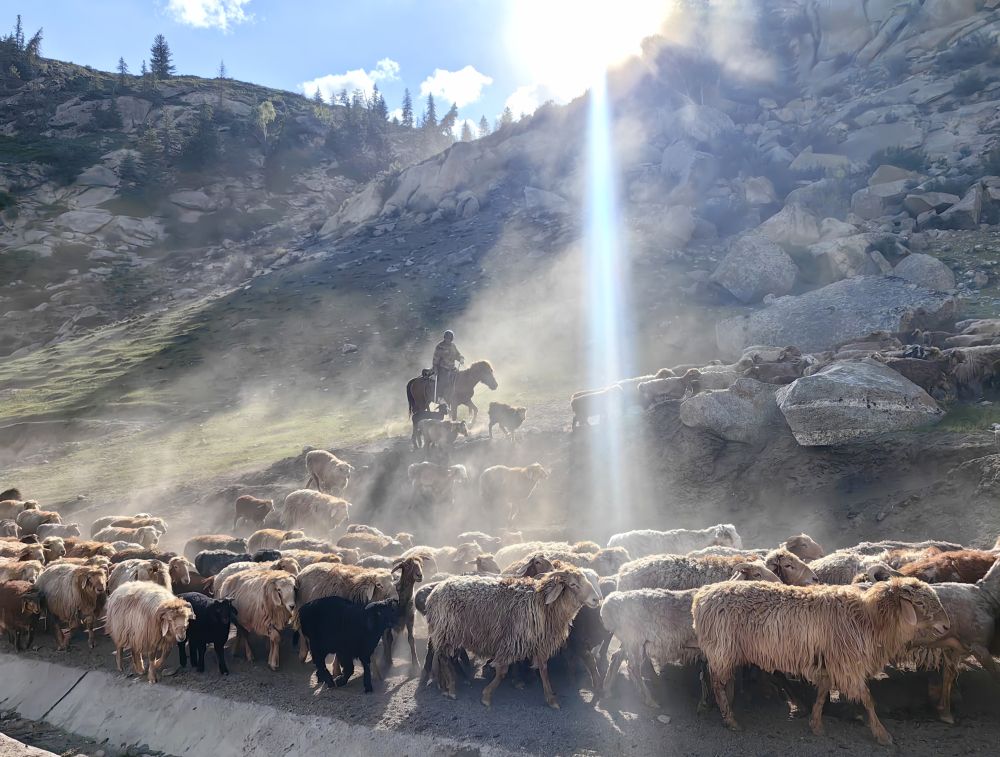 這是6月5日拍攝的新疆阿勒泰地區(qū)富蘊(yùn)縣山中的羊群。新華社記者 楊皓 攝