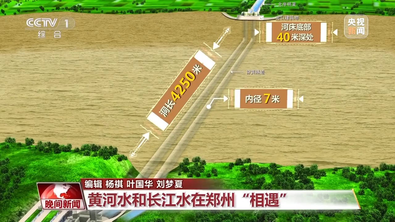 南水北調工程建設者在鄭州花園口西黃河河床底部40米深處開鑿兩條隧道,穿黃隧道為雙線有壓輸水隧道,單個洞長4250米,內徑7米,這樣的內徑可以滿足洞內跑汽車。有了“穿黃工程”,北上的長江水通過兩條穿黃隧道與黃河立體交叉相遇。平時,黃河水在上面流,南水北調的長江水在河底隧道中流過,兩者上下而過,猶如一條巨龍在黃河之下隱去了身影。