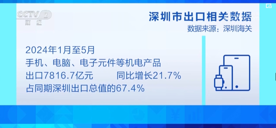2024年前5個(gè)月,深圳市出口總額達(dá)1.16萬(wàn)億元,同比增長(zhǎng)37.2%。其中,手機(jī)、電腦、電子元件等機(jī)電產(chǎn)品出口7816.7億元,同比增長(zhǎng)21.7%,占同期深圳出口總值的67.4%。