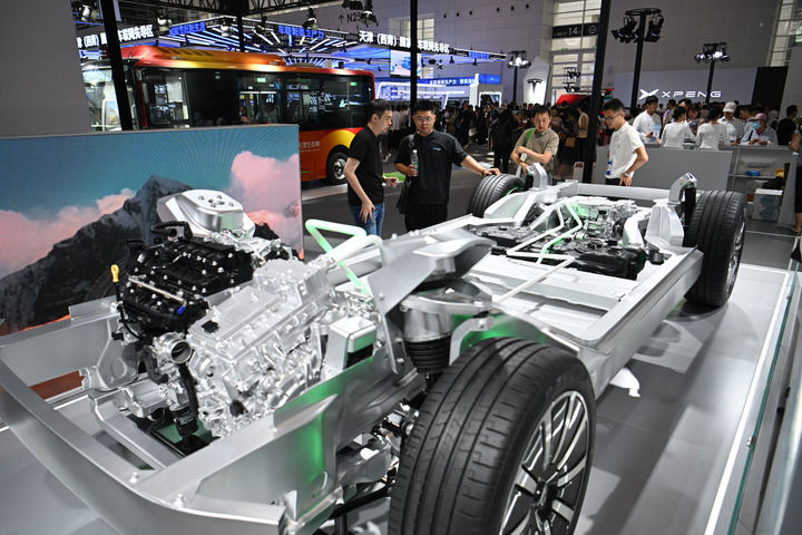 這是在博覽會現(xiàn)場拍攝的一款智能網(wǎng)聯(lián)汽車平臺架構(gòu)(6月20日攝)。新華社記者 孫凡越 攝