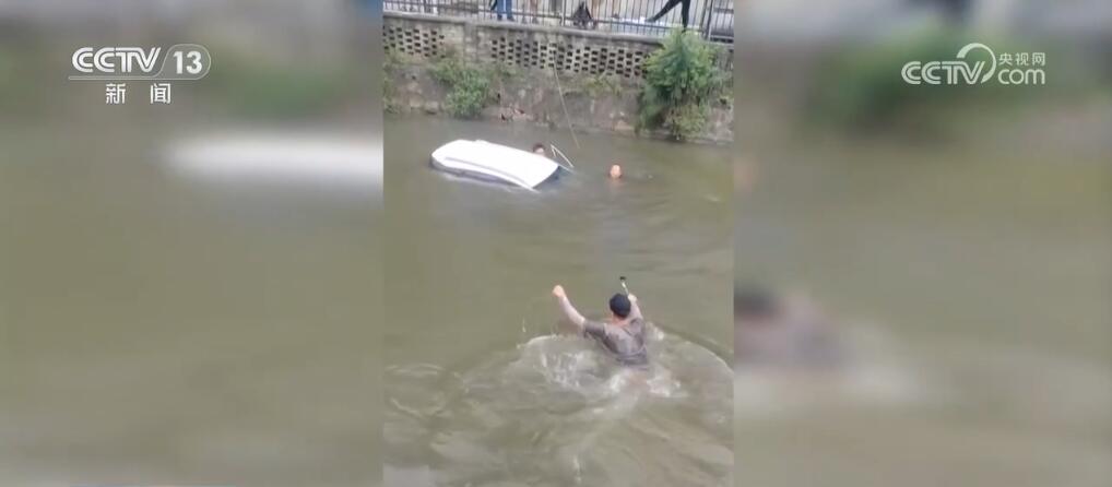 畫面中可以看到,這輛白色小車即將被河水沒過車頂。緊急關(guān)頭,三名熱心群眾先后跳下河涌,聯(lián)手營救被困司機(jī)。同時岸邊群眾也立即報警,請求救助。