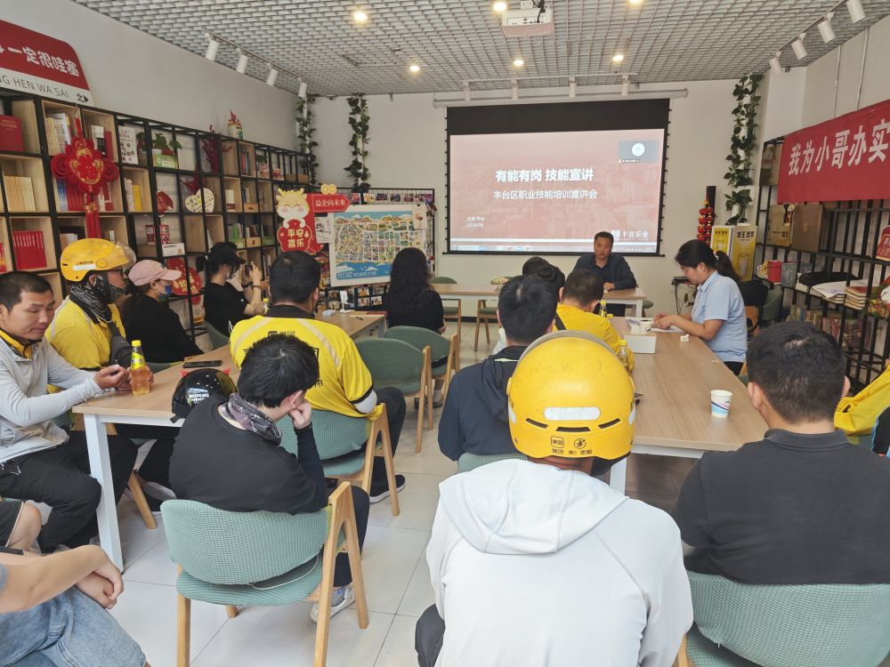 面向外賣員的職業(yè)技能培訓會在北京中關村豐臺園內的務工人員之家開講。新華社記者陳旭 攝