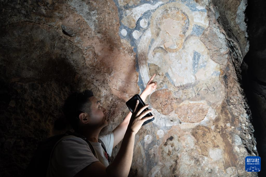 6月15日,在阿富汗巴米揚(yáng)省,中國學(xué)者邵學(xué)成在一處石窟中觀察壁畫。新華社記者 趙家淞 攝
