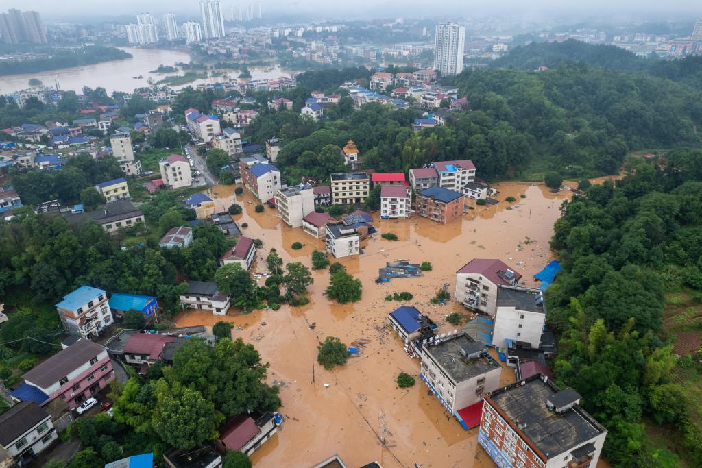 這是7月1日在平江縣天岳街道大西村拍攝的被淹現(xiàn)場(chǎng)(無人機(jī)照片)。新華社記者 陳思汗 攝