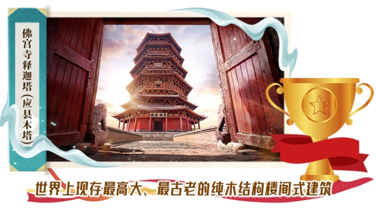 應(yīng)縣木塔建于遼清寧二年(公元1056年),與意大利比薩斜塔、法國(guó)巴黎埃菲爾鐵塔并稱(chēng)“世界三大奇塔”。采用純木結(jié)構(gòu)搭建,全塔無(wú)釘無(wú)鉚。全塔使用的斗拱形式達(dá)50余種,有“斗拱博物館”之稱(chēng)。