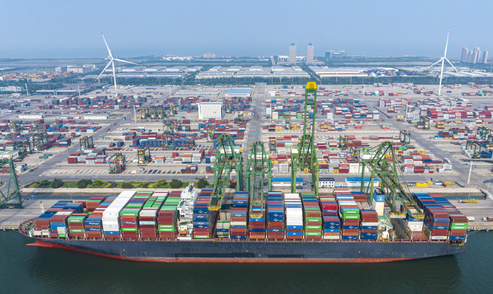 7月3日,一艘集裝箱貨輪??吭谔旖蚋厶窖髧H集裝箱碼頭(無人機照片)。新華社記者 趙子碩 攝