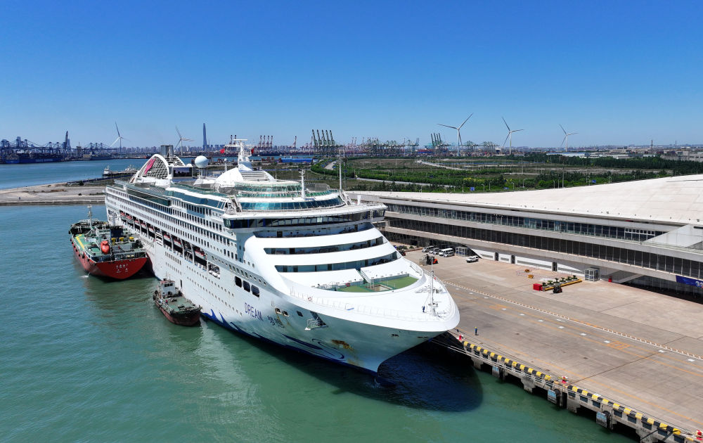 5月15日,“夢想”號郵輪??吭谔旖驀H郵輪母港(無人機照片)。新華社記者 趙子碩 攝