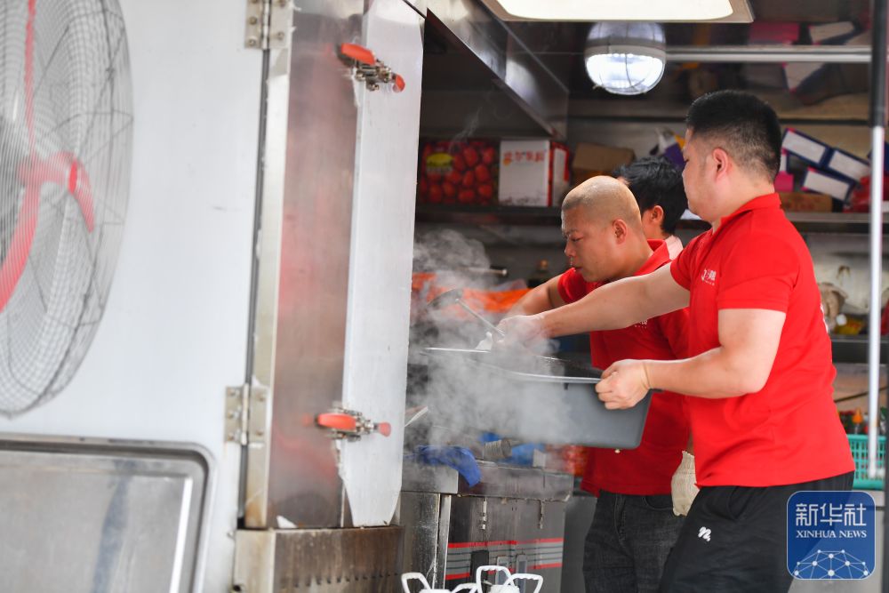 7月10日,在岳陽市良心堡鎮(zhèn)望君洲村,志愿者在炒制菜肴。新華社記者 陳思汗 攝