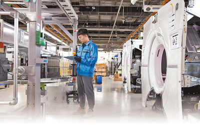 在通用電氣醫(yī)療北京生產(chǎn)基地,員工在記錄生產(chǎn)數(shù)據(jù)。