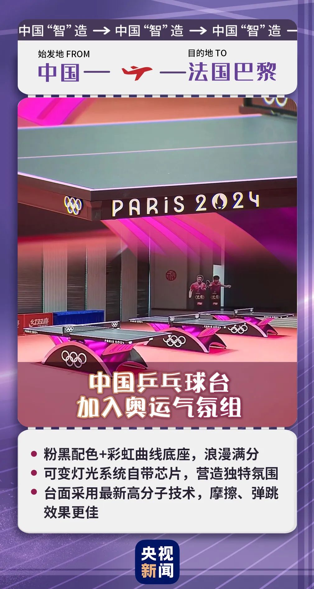 這次巴黎奧運會的乒乓球球桌是由中國“智”造的,是粉、黑色,搭配彩色的曲線底座,期待這樣浪漫的氛圍加上浪漫的巴黎,會有怎么樣的碰撞!