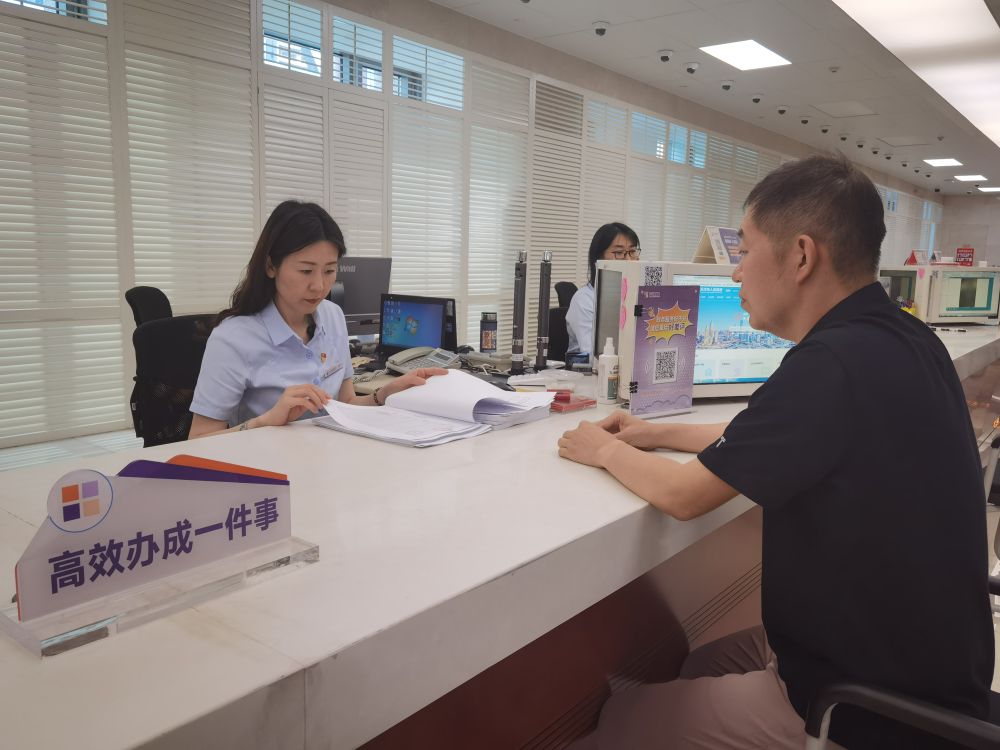 7月17日,在天津?yàn)I海新區(qū)政務(wù)服務(wù)中心“高效辦成一件事”專區(qū),企業(yè)負(fù)責(zé)人正在提交申請(qǐng)材料。新華社記者楊文 攝