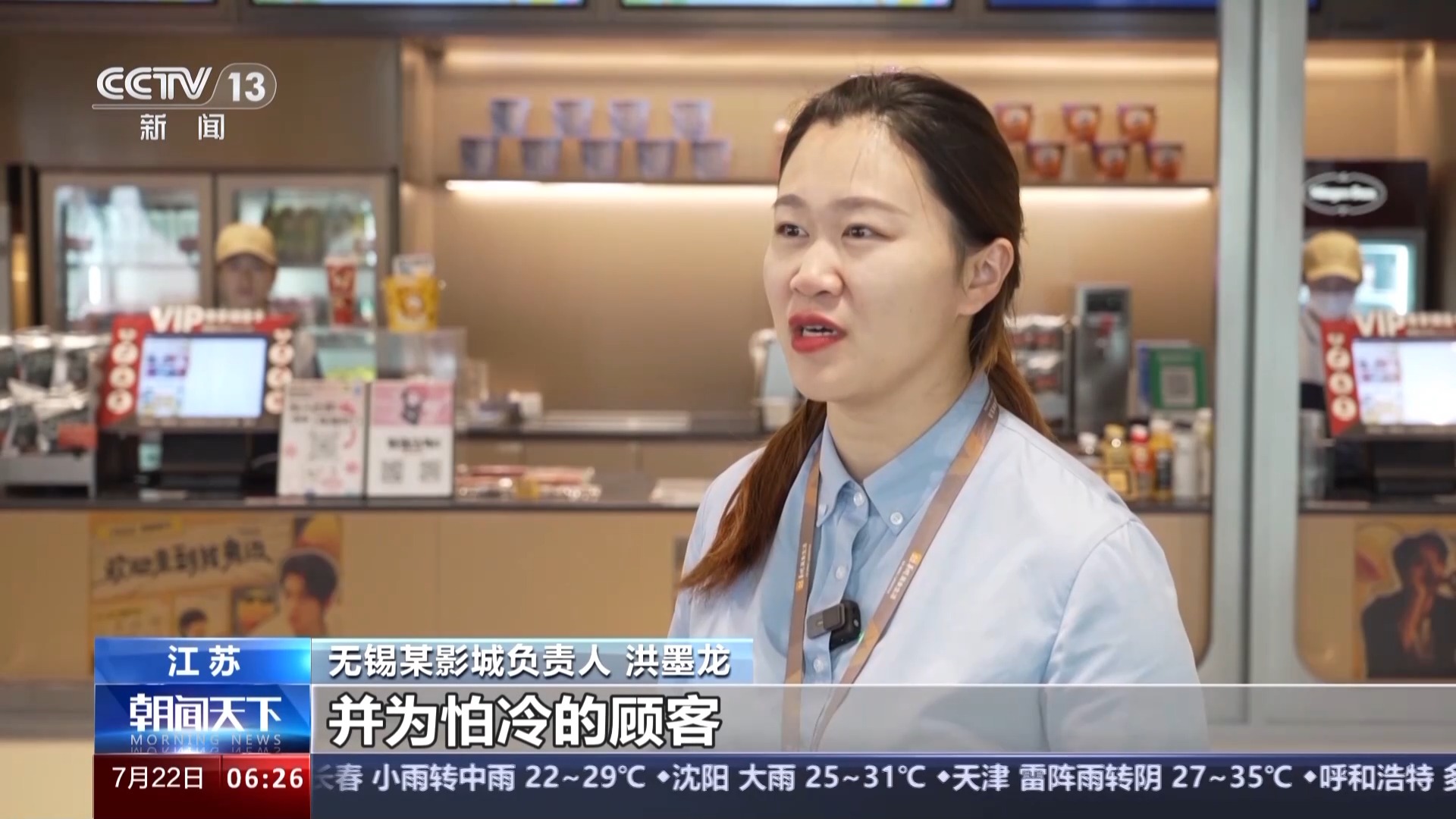 無錫某影城負責(zé)人 洪墨龍:首先我們保證影廳的溫度適宜,并為怕冷的顧客提供免費干凈的毛毯。我們還會通過現(xiàn)場的陳列布置,打造主題觀影氛圍,讓觀眾在觀影過程中有更多的參與感和互動體驗。