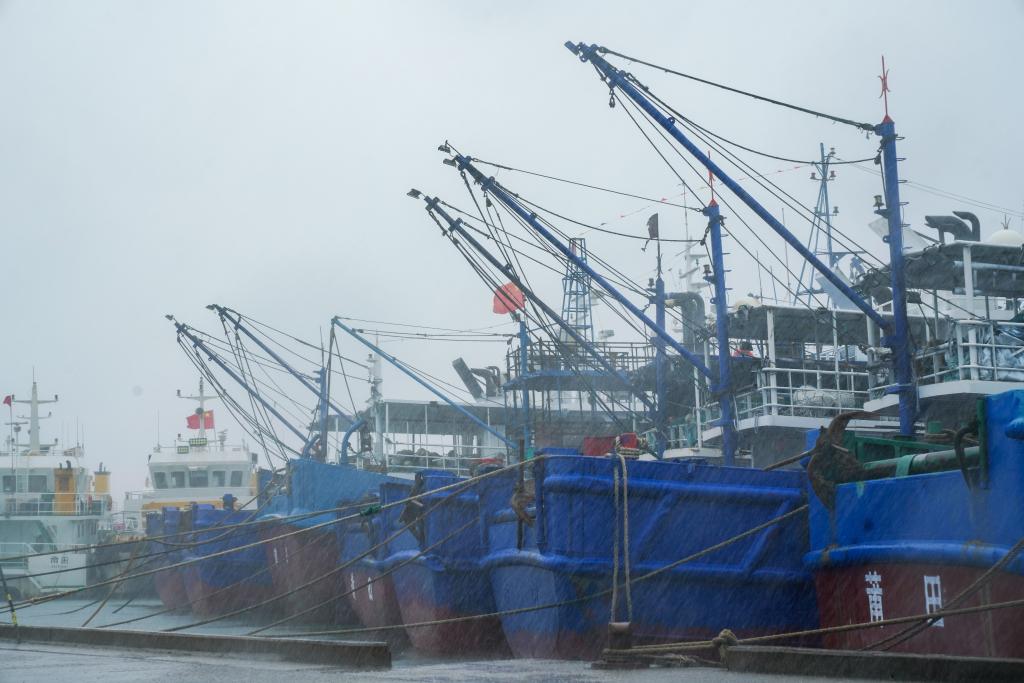 7月25日下午,在位于福建省莆田市秀嶼區(qū)埭頭鎮(zhèn)的石城國(guó)家一級(jí)漁港,今年第3號(hào)臺(tái)風(fēng)“格美”的外圍風(fēng)圈已經(jīng)襲來(lái)。七八級(jí)的陣風(fēng)夾雜著豆大的雨點(diǎn)打在臉上,裹挾著三四米高的海浪拍擊著護(hù)堤,激起白茫茫一片水花。漁港里,100多艘大小船舶已在24日中午12點(diǎn)前回港,呈“半月環(huán)抱”狀整齊停泊,船舶間已用纜繩加固。