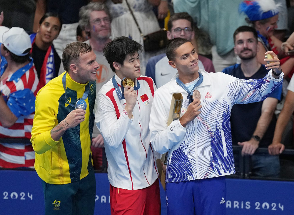 ↑冠軍中國選手潘展樂(中)、亞軍澳大利亞選手查默斯(左)與季軍羅馬尼亞選手波波維奇在頒獎(jiǎng)儀式后。新華社記者 雒圓 攝