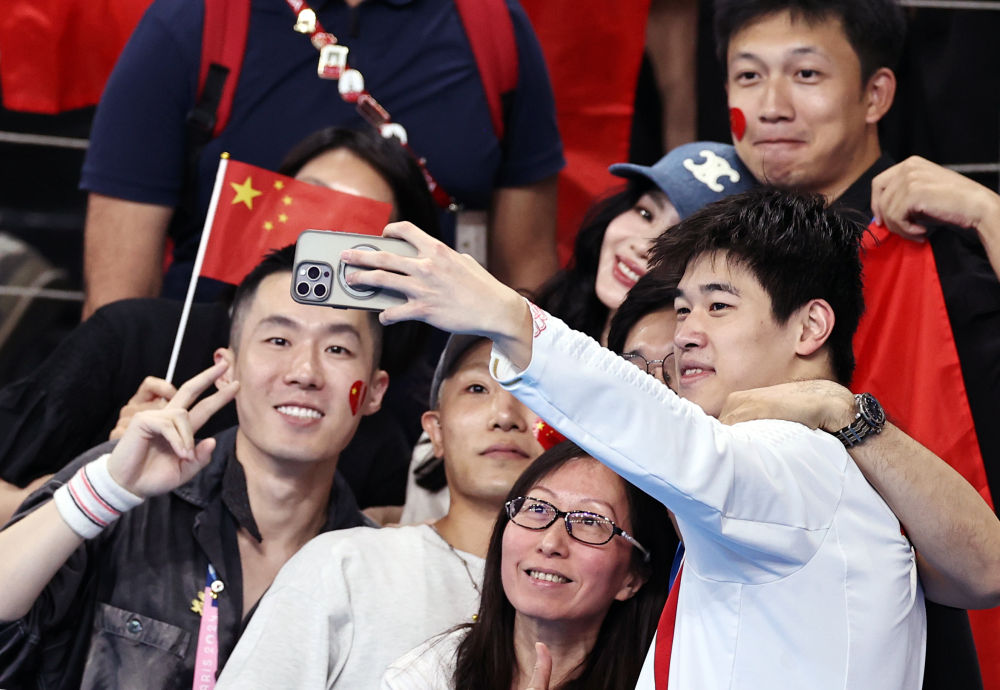 ↑中國選手潘展樂(右一)在頒獎(jiǎng)儀式后與觀眾合影。新華社記者 雒圓 攝